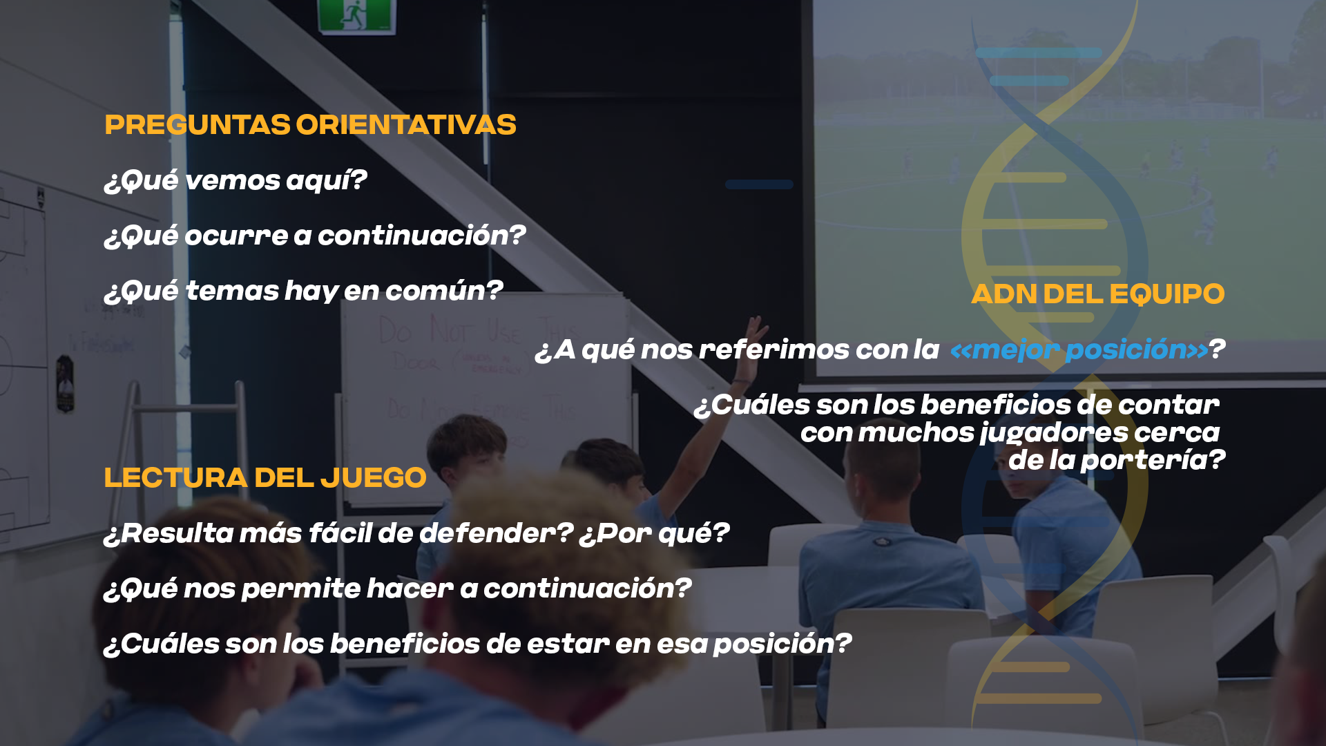 En lugar de limitarse a dar soluciones, el entrenador impulsa activamente el aprendizaje formulando preguntas para que los jugadores relacionen sus observaciones con el ADN del equipo y el modelo de juego del club.